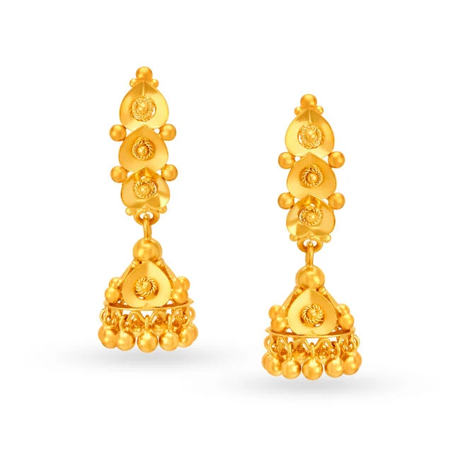These gold jhumki earrings blend traditional charm with modern refinement. The classic dome silhouette, detailed craftsmanship, and smooth gold finish make them an effortless statement piece for festive events, weddings, or everyday elegance. Designed to offer a gentle sway without feeling heavy, they add just the right amount of radiance to highlight your features. Their timeless appeal ensures they pair beautifully with ethnic outfits as well as contemporary looks, making them a versatile addition to any jewellery collection.